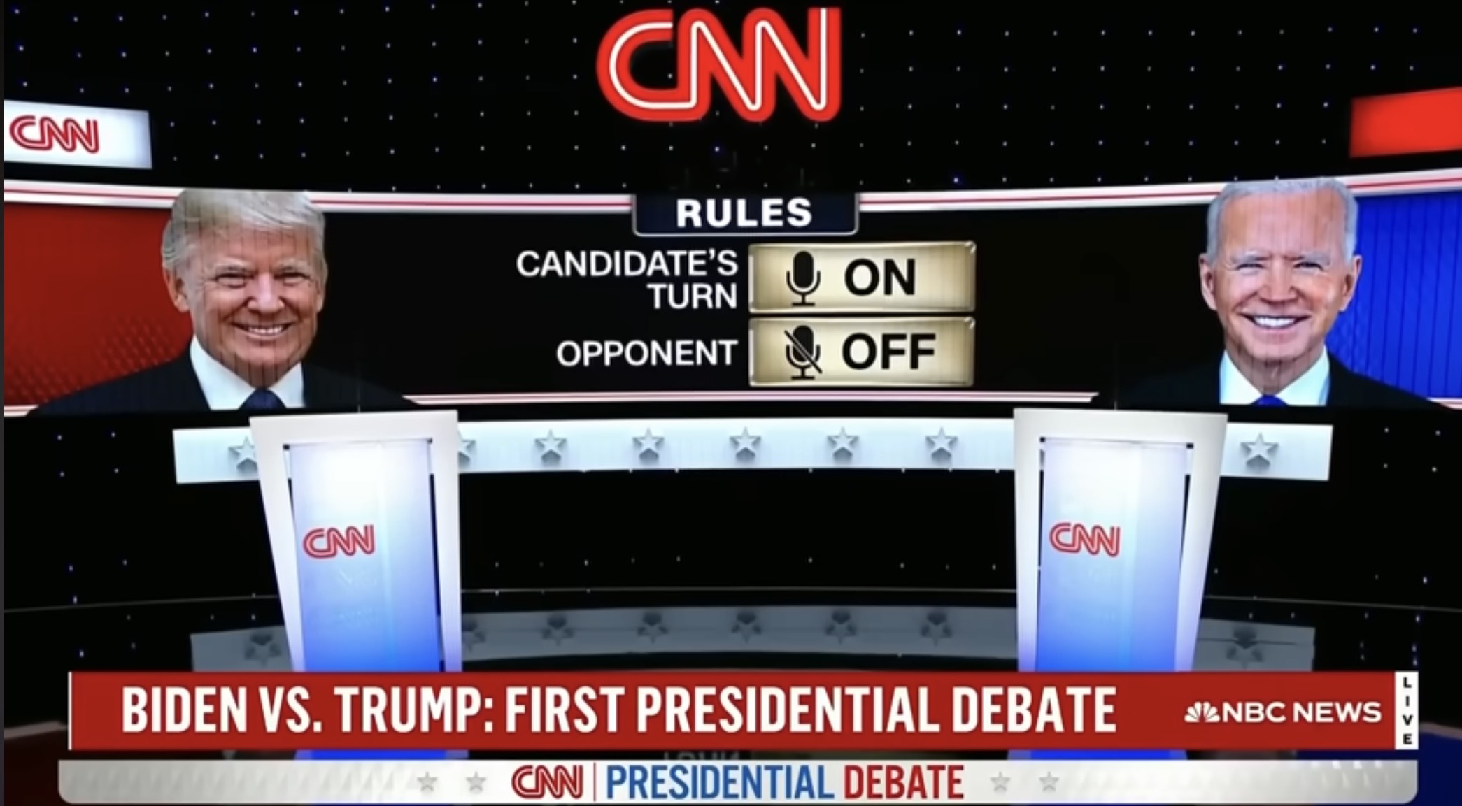 佩戴紅色領帶的美國上第45任總統唐納德·川普(Donald Trump),他正在團隊的簇擁下,目露凶光、六親不認地走上了賽場,另一位選手是美國的現任總統小約瑟夫·拜登(Joe Biden),他風塵僕僕,行動稍有不便請大家耐心等待一下。