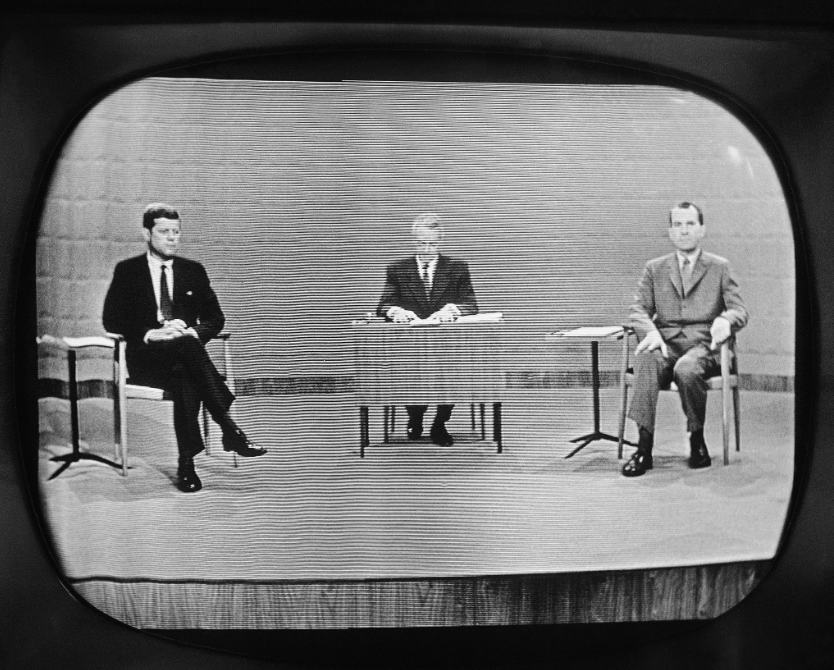 在1960年的辯論中,尼克松因為其對外交政策的瞭解,被認為會佔上風,但由於他對電視辯論的直播形式不適應,以及他面色蒼白,灰色西裝顏色與背景不協調,並且拒絕化妝又因為現場強烈燈滿頭大汗等因素,讓公眾對他的形象大打折扣,從而在首場辯論中表現不佳,辯論結束後的民調顯示,肯尼迪從略微落後於尼克松,變為略微領先,三次辯論之後,肯尼迪最終贏得了美國第16任總統,總統辯論四年一次,兩位候選人必須來到現場,在一個大廳裡面對面進行唇槍舌戰,各自陳述自己的政策,並指出對方的問題和不足。